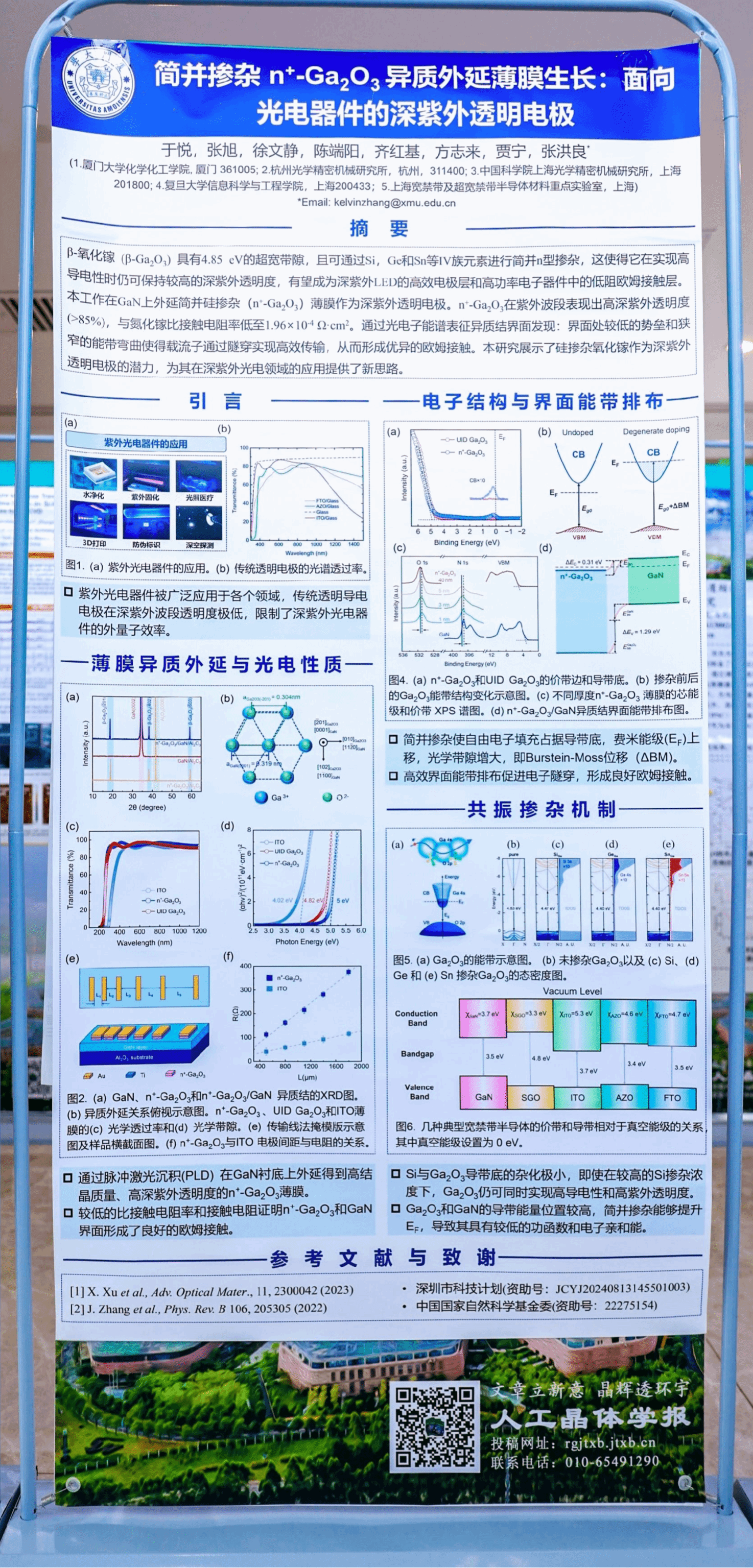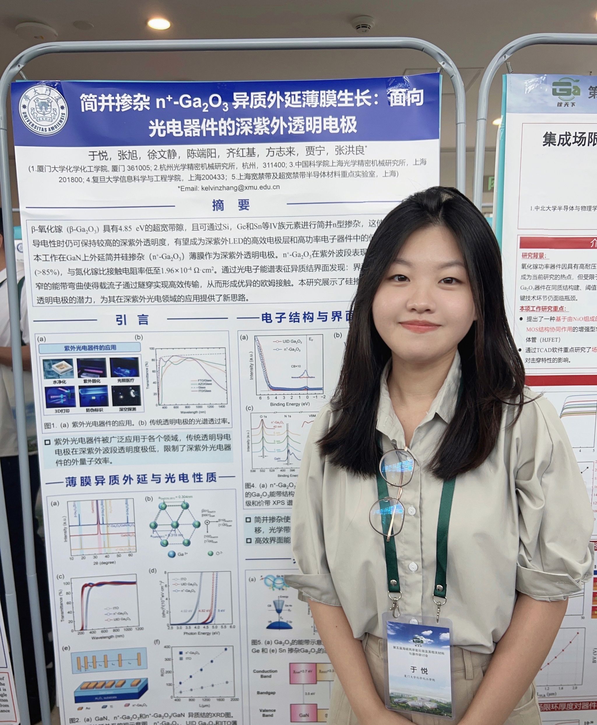 本次课题组展出了两组科研海报,聚焦氧化镓异质结的电子结构演化与能带排布研究,以及简并掺杂n⁺-Ga₂O₃异质外延薄膜在深紫外透明电极中的应用,体现了课题组在超宽禁带半导体材料与器件领域的深入探索。
